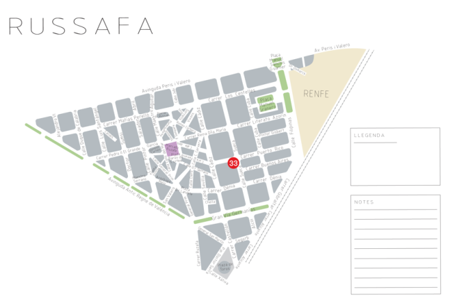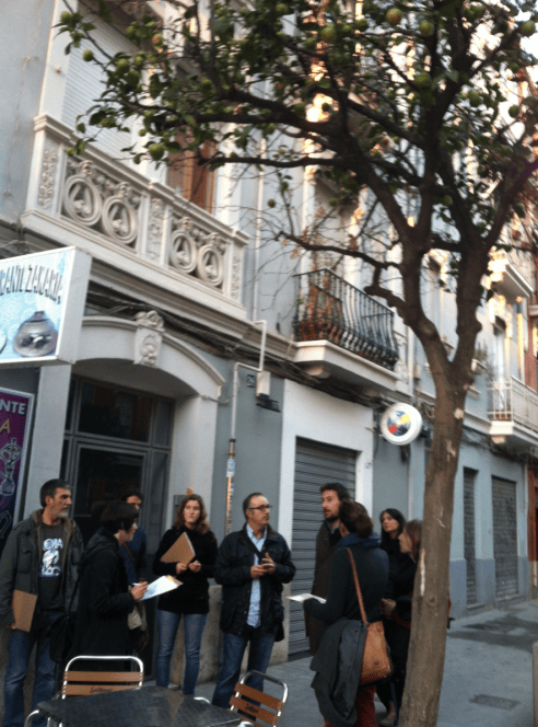Cuando en 2014 concebimos la realización del taller «Derives entorn a la ciutat: La natura com a resistència», en el marco de la iniciativa «Parlem d’art públic», impulsado por la Universitat de València y que tendría lugar en una galería de arte situada en el barrio de Russafa (València), decidimos centrarnos en las sinergias que actúan en el barrio, en proceso de gentrificación. Para ello, invitamos a otras tres personas: Carles Dolç, un urbanista especializado en los cambios en la ciudad debidos a movimientos sociales; Mariví Martín, una activista de la asociación de vecinos del barrio, que nos contó las luchas y las fuerzas presentes en el barrio; y un botànico, Simón Fos, que realizó una guía por las especies vegetales autóctonas que crecen en el barrio a pesar de la fuerte urbanización. Así, en lugar de una conferencia-taller, se generó una práctica artística alrededor de la deriva y la figura del flâneur, en la que se invitaba al público asistente a participar del paseo y del debate.