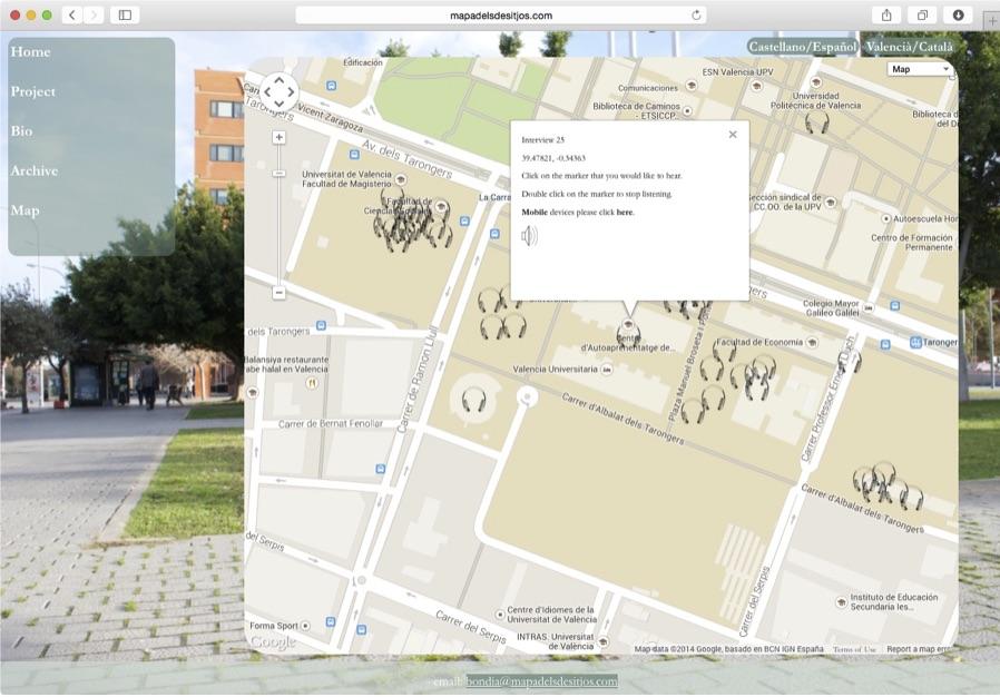 Esta forma de trabajo alrededor del espacio físico y el espacio red queda reflejada en el modo operante y en el resultado de nuestra pieza «Mapa dels desitjos:Voces de la comunidad universitaria». Esta intervención en el espacio público, presentada con motivo de la XVII Mostra d’art públic per a joves creadors en octubre de 2014, incluye un archivo de entrevistas sobre los deseos de los diversos miembros de la universidad, así como un mapa sonoro online del campus, con las entrevistas ubicadas en los lugares preferidos de los entrevistados. Nos parecía interesante plantear cómo el espacio educativo se interrelaciona con los deseos y ambiciones de estudiantes, profesores y trabajadores de la universidad. Esta reflexión sobre el espacio urbano y sus extensiones via realidad aumentada ha servido para definir el mencionado anteriormente «Texto hiperlocal».