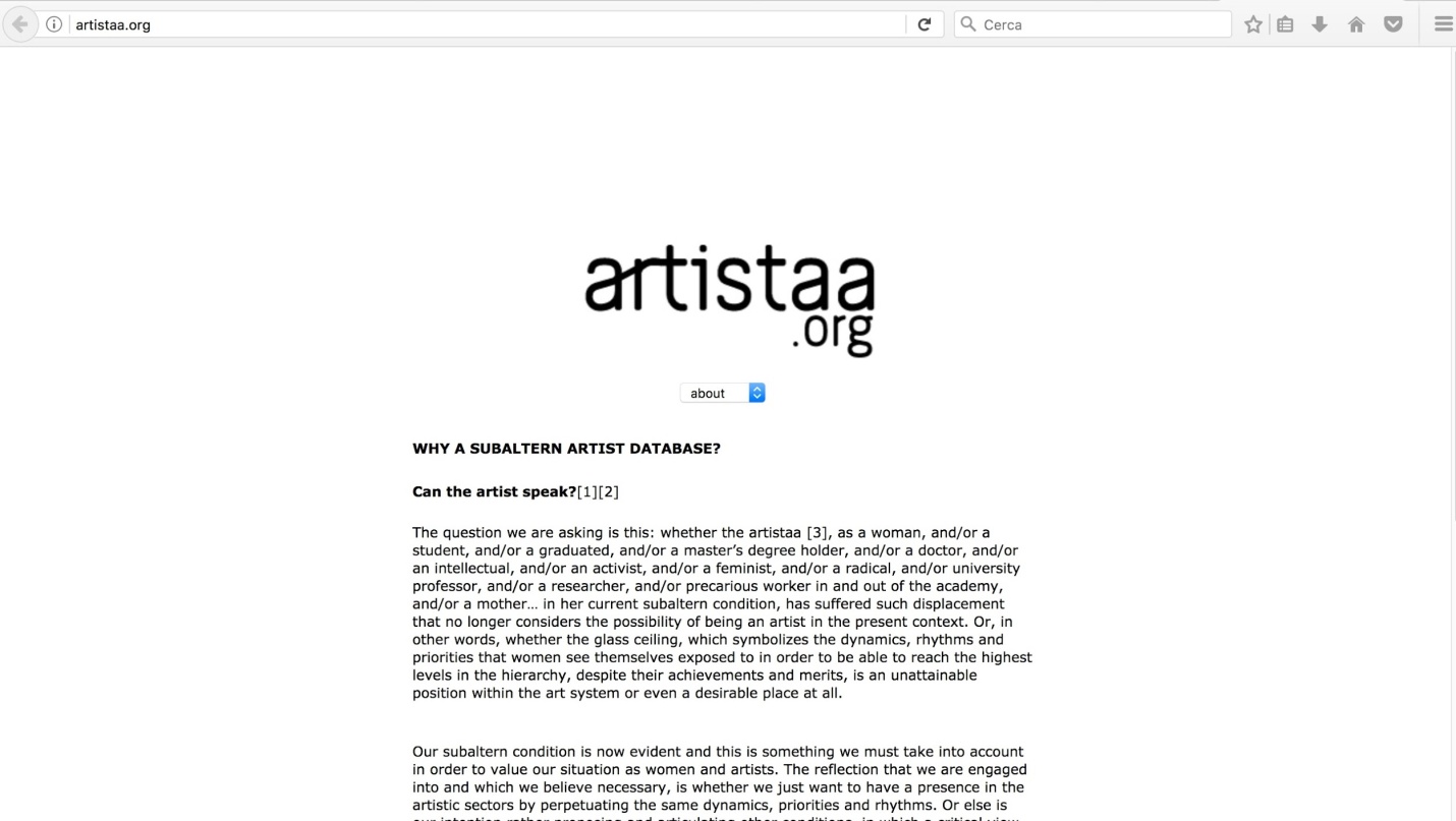 Una acción que hemos emprendido al respecto, orientado hacia ese cambio de paradigma en el arte que mencionamos al inicio, es la creación de la base de datos artistaa.org. En ella, recopilamos los datos de aquellas que quieran participar, para podernos hallar y referenciar, como un directorio artístico y conceptual. Primero, presentamos el concepto de 'artistaa', término prestado de Silvia Martí Marí (2016) para designar a la mujer artista, y que nosotras extendemos a las artistas conscientes de su condición de subalterna en el mundo del arte como movimiento especulativo, y que como tales rechazan participar de él en los términos prescritos tradicionalmente. Las artistaas pueden registrarse enviando sus señas, su web y una foto o texto con que quieran presentarse en la base de datos. Esto nos ayuda como investigadoras para poder hallar otros referentes diferentes de aquellos apoyados por la historia oficial y por el arte de mercado.