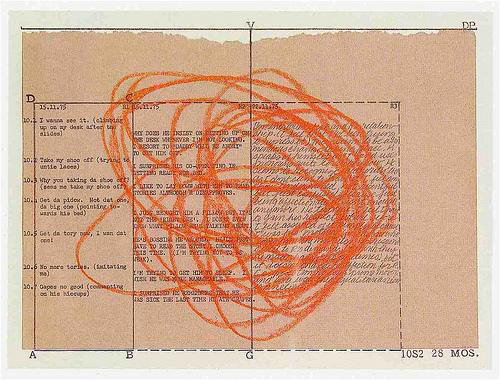 Documentation III, Analysed markings and diary-perspective schema (1975). Detalle, cartulina blanca, papel, ceras. 1/13 piezas, 35.5 x 28 cm cada una.