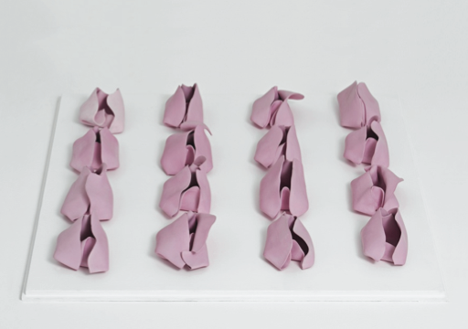 En 2013, realicé mi primera obra en cerámica de una manera intuitiva que más tarde he relacionado con el cunt art de Judy Chicago y Hannah Wilke, «Blanco». Se compone de una serie de vaginas repetidas a partir de un molde,técnica industrial. Cada una está prensada con un tipo de tela diferente. Al acercarnos percibimos que aunque parezcan idénticas, cada una tiene un relieve diferente; algunas con bordados de flores, bordados de encaje, telas suaves, blandas, rígidas. Lo mismo ocurre con la identidad de género ligada al sexo culturalmente. Aunque parezca que la etiqueta 'mujer' puede definir a las personas nacidas con el mismo sexo, cada cuerpo y subjetividad están marcadas de maneras diferentes.