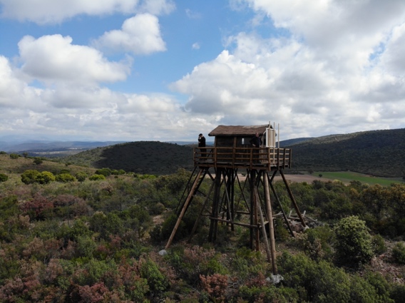 Alessandro Taiana y Rubén Martín de Lucas en una torreta de avistamiento en «La naturaleza del paisaje».