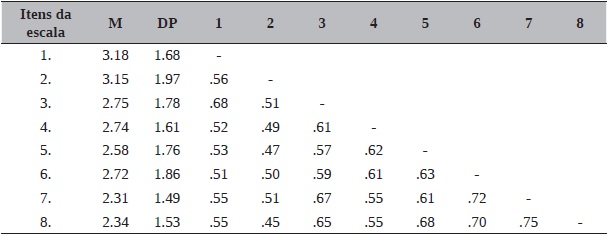 A correlação inter-itens mais baixa é de .45 (entre o item 2 e o item 8), a mais alta de .75 (entre os itens 7 e 8), com uma média de correlações de .58. Todos os valores de correlação inter-itens são significativos (p < .01). O determinante da matriz de correlações é de .006, o que indica a possibilidade de se realizar uma análise factorial, possibilidade essa que é sugerida também pelo Teste de Esfericidade de Bartlett (x2(28, N=144)=707.191 (p<.000)) e pelo valor do índice de Kaiser-Meyer-Olkin (K.M.O.=.913)6.