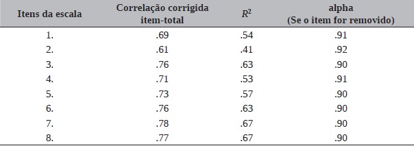 O valor alpha de Cronbach8 é de .91, o que sugere uma elevada consistência interna dos itens da escala, a qual é confirmada pela análise dos valores do quadrado da correlação múltipla, que variam entre .41 e .67, o que sugere que os itens partilham entre si percentagens importantes da sua variância (Tabela 3). O valor alpha baixa com a remoção de qualquer um dos itens da escala, excepto no caso do item 2 (A primeira coisa de que me lembro quando acordo é ligar-me ao Facebook), cuja remoção mantém o valor do alpha constante.