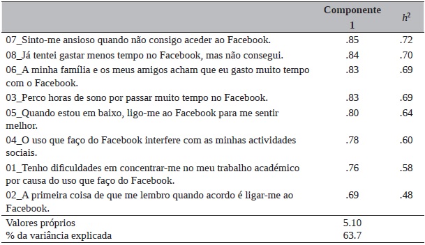 O principal objectivo foi o de desenvolver os estudos exploratórios de validade de constructo de uma versão portuguesa da Escala de Adição ao Facebook de Koc e Gulyagci (2013), no sentido de disponibilizar um meio para a investigação do fenómeno da utilização de uma das ferramentas tecnológicas mais vulgarizadas: o Facebook. Apesar de se tratar de um primeiro estudo, com uma amostra de conveniência limitada (o qual não exclui a necessidade de se realizarem estudos complementares de validade), não deixa de ser pertinente realçar alguns dos resultados obtidos. Em primeiro lugar, há a destacar a estrutura uni-factorial da escala. A utilização do método das componentes principais, com rotação varimax, permitiu a produção de uma solução com uma só componente principal, capaz de explicar 63,7% da variância total e na qual a totalidade dos itens satura significativamente acima de .69 - com valores de comunalidade bastante importantes (acima de .48), o que parece reforçar o modelo factorial original dos autores da escala. Em segundo lugar, o facto do valor alpha encontrado ser muito alto (.91), associado à circunstância de a remoção de qualquer um dos itens da escala contribuir para uma redução desse valor, sugere uma consistência interna muito boa.