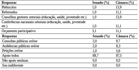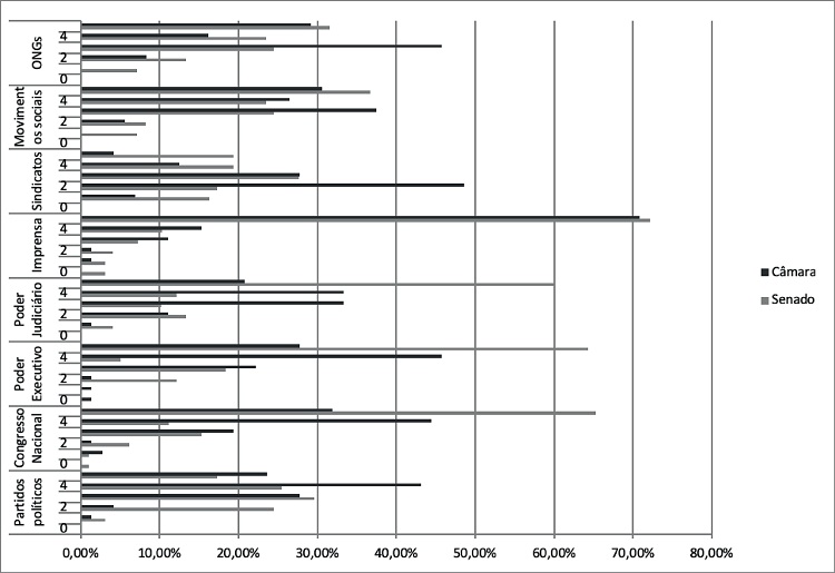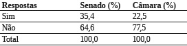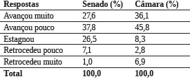 Ao serem indagados sobre a situação da democracia brasileira nas últimas décadas, a opinião dos dois grupos apresenta mais similaridades do que divergências. A principal semelhança diz respeito aos maiores percentuais no item “avançou pouco” (36,7% e 45,8%, respectivamente), seguida da alternativa “avançou muito” (23,5% e 26,1%), como mostra a Tabela 4. A terceira convergência está na alternativa “retrocedeu muito” (6,1% e 6,9%, respectivamente). A única divergência refere-se ao item “retrocedeu pouco” (11,2% no Senado e apenas 2,8% na Câmara).