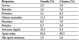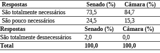 Os dados mostram elevada taxa de adesão dos respondentes à democracia e uma percepção positiva dos avanços no combate à corrupção. Diferentemente da opinião da maioria da população brasileira, os jornalistas das duas instituições consideram que os partidos políticos são indispensáveis nos regimes democráticos. Tal visão certamente se justifica porque esses profissionais lidam diretamente com a atuação dos partidos no âmbito das duas instituições. Afinal, as agremiações partidárias exercem muito poder na esfera parlamentar, conforme registra a literatura da área de Ciência Política, a exemplo de Scheeffer (2015) e Tarouco e Madeira (2013).