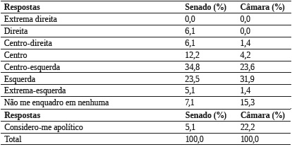Os valores políticos dos informantes se justifica pela posição política que eles assumem. Em termos políticos, os informantes se auto-declaram principalmente de centro esquerda, de esquerda e de centro, com perfil progressista em termos de valores políticos. Convém frisar que não houve registros de respondentes de extrema direita e apenas 6,1% de direita no Senado.