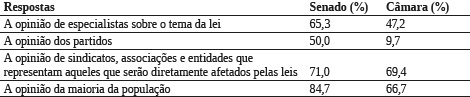Questionados em relação a que segmentos o Governo e o Congresso Nacional deveriam considerar ao propor novas leis ou ao alterar a legislação existente, prevalece nos dois grupos a percepção de que deveria ser levada em conta a opinião da maioria da população, embora os demais segmentos elencados no questionário também sejam considerados relevantes (Tabela 14). Mas chama atenção o pressuposto de participação da sociedade no processo legislativo, reiterando mais uma vez a participação como um valor democrático. Isso certamente significa uma rejeição ao modelo atual de legislar, em que o Poder Executivo e o Congresso formulam novas leis e alteram as já existentes, incluindo a Constituição, sem consultar o povo.