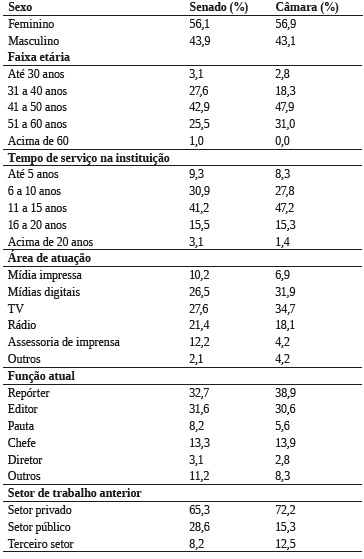 O grupo de respondentes de cada instituição corresponde a 52,7% do total de jornalistas do Senado e 52,2% da Câmara, como mostra a Tabela 2. Ambos os grupos são estatisticamente representativos, pois somam mais da metade dos jornalistas das duas instituições.
