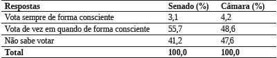 Outra questão relevante sob a ótica dos valores políticos é a avaliação dos informantes sobre o voto do conjunto dos cidadãos brasileiros. Isso porque nos países com eleições democráticas o voto é igualitário, sem pesos diferenciados como na época do voto censitário. Trata-se de um princípio formal de igualdade política, eliminando, em tese, as interferências de hierarquias econômicas e sociais. Essa visão hierarquizada e valorativa do voto, contudo, ainda aparece na percepção dos dois grupos consultados, como mostra a Tabela 6. Em ambos os grupos predomina a visão elitista de que a maioria dos eleitores brasileiros “vota de vez em quando de forma consciente” ou mesmo a opinião de que o povo “não sabe votar”.