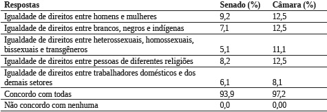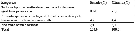 Além disso, os informantes revelam elevada adesão ao valor da igualdade como pilar da democracia, inclusive com a defesa das políticas de direitos igualitários e dos direitos das novas configurações familiares. Ao serem indagados sobre os direitos das famílias na atualidade, 88,4% dos jornalistas do Senado e 91,2% da Câmara responderam que todos os tipos de família devem ser tratados de forma igualitária perante a lei. Essa é uma questão emblemática no atual debate sobre igualdade de direitos no Brasil, com extenso debate no Congresso Nacional, conforme foi abordado anteriormente.
