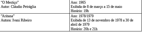 Os quadros que apresentamos neste tópico reúnem as telenovelas veiculadas nas principais emissoras de televisão brasileiras. Adotamos o critério de organizá-los por emissoras. E, em relação à Rede Globo, pelo volume das telenovelas com personagens indígenas, detalhamos as produções considerando as décadas em que foram ao ar.