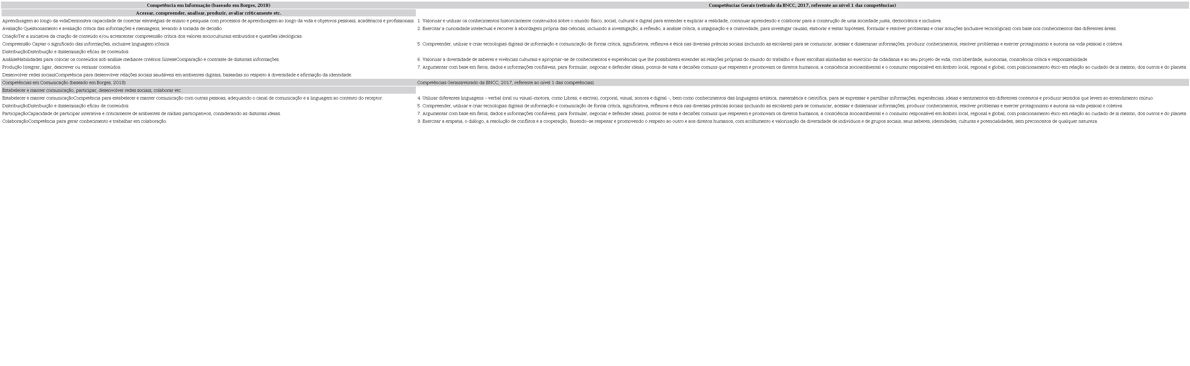 De um modo geral, a BNCC enfatiza a importância de “valorizar e utilizar os conhecimentos” (competência geral 1); “investigar, refletir, analisar criticamente” (2); “expressar... informações” (4); “acessar e disseminar informações” (5), que estão em consonância com as competências informacionais: “acessar, compreender, analisar, produzir, avaliar criticamente etc” (BORGES, 2018, p. 127).