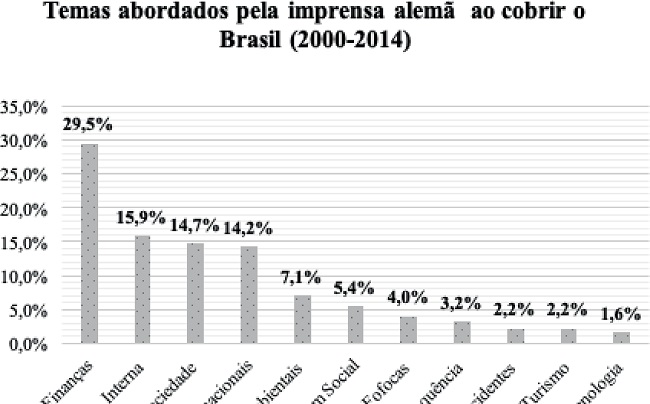 Até 2014, as notícias sobre o Brasil não focalizavam problemas de ordem política e da repartição dos poderes no país, como observado nos casos da Venezuela, Honduras, Colômbia, Bolívia ou Equador (CAZZAMATTA, 2020a). O pouco interesse recebido por temas políticos foi contrastado pela predominância de assuntos econômicos e culturais. No entanto, apesar da saliência de temas financeiros, pode-se questionar se a imprensa alemã tem, de fato, interesse no desenvolvimento da economia brasileira per si. Na área “Economia e Finanças”, os dois temas centrais foram a) “moeda, ações e bolsa de valores” e b) “América Latina como mercado crescente de investimento e como local de produção”, ou seja, são questões relevantes para empresas, investidores e indústrias alemães. Assim, Hafez argumenta que a imprensa está menos interessada em processos econômicos internos per se, já que as coberturas se concentram principalmente em assuntos de relevância global, isto é, desenvolvimentos econômicos regionais ou locais que podem ser significativos para a Alemanha e outras nações ocidentais (HAFEZ, 2002b).