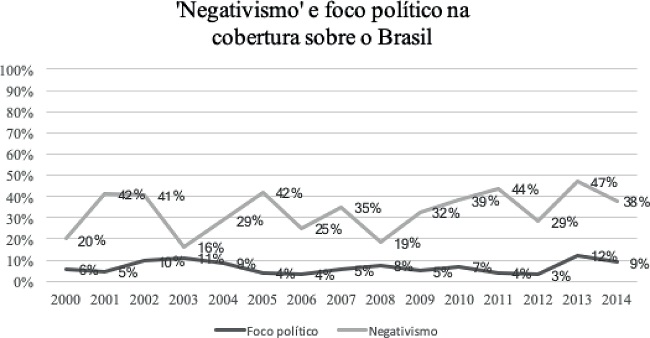Enquanto a frequência de cobertura política permanece mais ou menos estável durante os anos (variando de 4% a 12%), a oscilação do “negativismo” mostrou-se mais robusta (de 16% a 47%, considerando todas as áreas cobertas), como ilustrado pelo Gráfico 4. No entanto, mesmo em 2013, a quantidade de “negativismo” não ultrapassou o limite de 50%, como afirmado anteriormente. Outras áreas como “Cultura e Sociedade” compensaram a cobertura negativa, equilibrando a forma de representação, ou seja, a imagem do país.