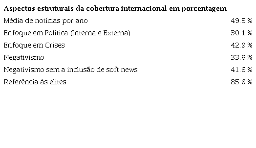 Palabras clave: cobertura internacional, imagen brasileña, factores de noticias, NOMIC, características estructurales de la cobertura internacional.