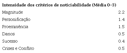 A fim de revisitar os padrões de reportagem adotados pela Alemanha ao noticiar o Brasil, todos os artigos foram analisados com base na divisão de 11 áreas temáticas – ou editorias –, temas centrais e secundários, atores representados5 e tom do evento (positivo, negativo ou neutro6). Para além da frequência, também examinamos a manifestação dos critérios de noticiabilidade com base em uma escalada de intensidade (0: não reconhecida; 1: leve; 2: média; ou 3: forte), a qual foi introduzida e testada por estudos prévios (HARCUP; O ‘NEILL, 2017, SCHULZ, 1976, STAAB, 1990a). Em linhas gerais, os seguintes critérios de noticiabilidade foram codificados: