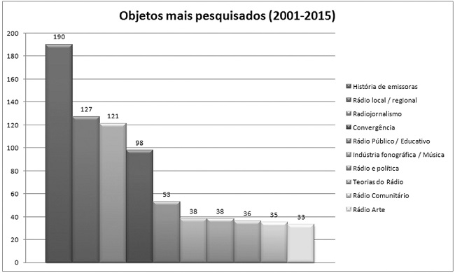 Assim como nas perspectivas teóricas, foi necessário agrupar alguns dos objetos (Rádio Público e Educativo; Rádio Local, Regional e/ou Rural, por exemplo), devido a clara afinidade entre estes, mas optou-se por conservar algumas categorias independentes, como Web Rádio, Podcasting e Rádio Digital, embora os três estejam inseridos na lógica da Convergência Midiática. Isso ocorreu para que pudesse ser captada a variação de interesse que cada uma dessas modalidades radiofônicas suscitou nos pesquisadores ao longo dos anos.