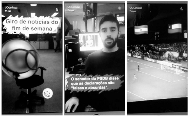 Já o formato “Entrevistas” pode ser visto no caso da entrevista exclusiva para o Snapchat feita pela equipe do UOL com o cantor Zé Felipe, em que repórter e entrevistado se dirigiram diretamente à tela do aplicativo. O vídeo apareceu na unidade coletada no dia 24 de junho.