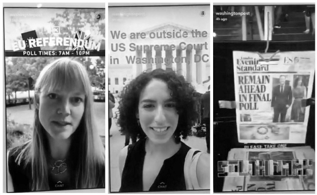 Entre os exemplos de “Histórias narradas em imagens” está a cobertura da saída do Reino Unido da União Europeia pelo @washingtonpost. Foram duas publicações diferentes sobre o assunto, nos dias 23 e 24 de junho. Em ambas, a repórter fez entrevistas com moradores de Londres questionando “o que a União Europeia significa para você?” e mostrando os locais de votação, o clima, os protestos e, inclusive, divulgou o resultado, às cinco horas e três minutos da manhã, anunciando que os “separatistas” haviam vencido.
