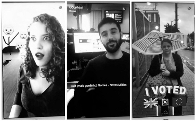 Abstract: This article aims to discuss how journalistic vehicles are appropriating the Social Network Site (SNS) Snapchat in order to circulate news content. The methodology of this descriptive-analytical study consists on a combination of quantitative and qualitative techniques (literature review, data collection, description and analysis). The research considered the posts published on Snapchat by the profiles of the newspaper The Washington Post and the news portal UOL between June 22nd and July 5th 2016, and is based on the notions of Social Network Sites (BOYD; ELLISON, 2007, 2013; RECUERO, 2009) and Snapchat appropriations by journalism (BRADSHAW, 2016). Given the categories of analyses (periodicity, length, narrative modality and format), we noticed similarities and peculiarities in the content published in the Stories section. We conclude that Snapchat is a tool with a lot of narrative potential, capable of attracting new audience.