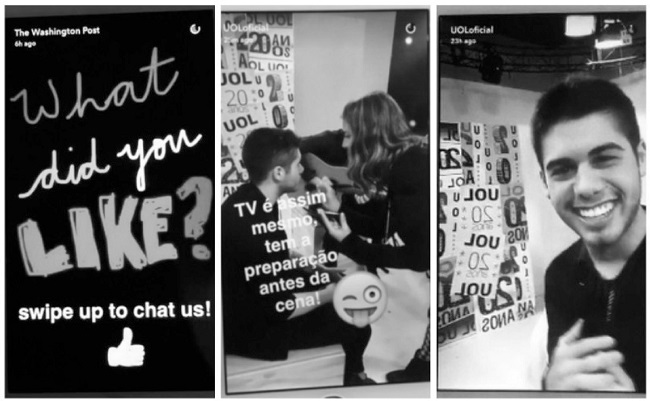 Para alcançar o objetivo deste artigo, elegemos dois perfis jornalísticos para serem examinados: o @washingtonpost, do jornal norte-americano The Washington Post, e o @UOLoficial, do portal de notícias brasileiro UOL – Universo Online. A escolha dessas duas contas é justificada pelo pioneirismo do The Washington Post nesse ambiente, pois foi um dos primeiros jornais a criar uma conta no Snapchat (no começo de 2014) e pela indicação do UOL como um dos finalistas na premiação entre os melhores produtos brasileiros em conteúdo e desenvolvimento para dispositivos móveis em 2016.