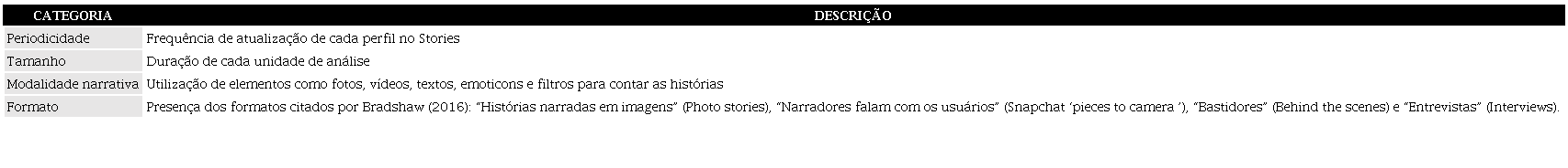A partir da revisão de literatura e da coleta das publicações dos perfis do The Washington Post (@washingtonpost) e do UOL – Universo Online (@UOLoficial) no Snapchat, descrevemos e analisamos como os veículos jornalísticos têm se apropriado desse site de rede social para a circulação de conteúdo noticioso por meio de quatro categorias: periodicidade, tamanho, modalidade narrativa e formato.