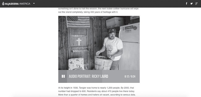 Dentre o conteúdo inovativo publicado pelo site da Al Jazeera, destacamos a grande reportagem multimídia “Treasured Island. The people of Tangier fear their life, land and heritage could wash away9”, que conta a história de uma comunidade de pescadores na ilha de Tangier, nos Estados Unidos. Nesta reportagem, é possível detectar alguns elementos de inovação narrativa: excertos de áudio em arquivos específicos e os audio portrait são elementos inovativos no tratamento estético do tema. Ainda que o recurso expressivo do áudio esteja sendo muito explorado em narrativas multimídia, inclusive em casos nos quais é o elemento principal, como a narrativa em podcast “Serial”10, na reportagem da Al Jazeera o mesmo aparece na forma de pequenos portraits, formatos breves nos quais um personagem é apresentado a partir de uma foto e acompanhado de um pequeno registro em áudio (Figura 1).