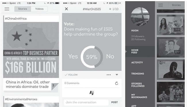 Além de reportagens com elementos inovadores, um dos destaques da Al Jazeera é o AJ+ (Figura 2). O AJ+ é uma aposta lançada em 2013, tendo como perspectiva o crescimento e a centralidade do uso de smartphones. A proposta é ser mais do que um site de notícias e apresentar um aplicativo focado fortemente em vídeo com uma estratégia de crescimento de audiência integrada às redes sociais na internet. A definição apresentada pelo aplicativo em seu site oficial dá conta de que o AJ+ é uma comunidade global de notícias para a geração conectada, com destaque para “trazer as histórias que estão moldando o nosso mundo” (Tradução nossa)11. A proposta é inovadora do ponto de vista que apresenta um discurso e um empacotamento voltado ao visual e ao público jovem, considerando ferramentas de edição, modo de apresentação, tratamento de pautas polêmicas e de temas sociais e, certamente, a abertura colaborativa e conectada ao Facebook, Twitter e You Tube.