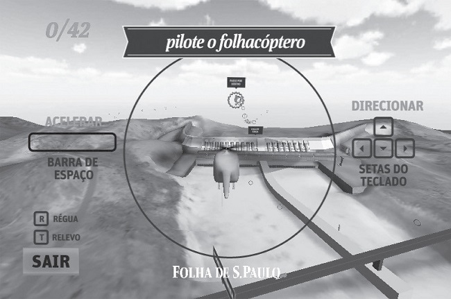 Um dos mais interessantes recursos expressivos trazidos pela série de reportagens, entretanto, está nos seus infográficos, para os quais a Folha criou uma nova definição: videográficos. O termo foi concebido pela própria Folha, para definir as infografias em vídeo que começaram a ser produzidas a partir de 2011, num momento em que a obsolecência da ferramenta Flash impunha novas soluções, segundo Ducroquet (2013). Mais recentemente, a Folha de S.Paulo lançou o Folhacóptero, um recurso expressivo que combina simulação de vôos sobre pontos geográficos com a interação do usuário. Isso acontece, por exemplo, no já citado “A Batalha de Belo Monte” (Figura 3), sendo necessário baixar um plug-in para que o conteúdo reproduza normalmente. Já no especial “O Rio em Transformação”, os infográficos variam de simulação em terceira dimensão dos locais dos jogos olímpicos até um sobrevoo em asa delta da cidade do Rio de Janeiro16, com sonorização ambiente.