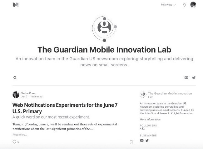O jornal britânico The Guardian – com edições internacionais norte-americana e australiana, lançou recentemente um laboratório de inovação voltado exclusivamente para as notícias em plataformas móveis. O The Guardian Mobile Innovation Lab (Figura 4) é basicamente um time de inovação alocado na redação do jornal nos Estados Unidos com três editores e três repórteres, lançado em 2015 no Medium17. O objetivo é explorar a maneira de contar e distribuir notícias em telas pequenas. O projeto foi uma iniciativa da John S. and James L. Knight Foundation, uma fundação privada e sem fins lucrativos dedicada a apoiar ideias transformadoras que promovem o Jornalismo de qualidade, inovação e avanço da mídia.