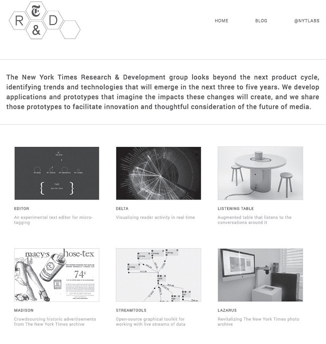 O norte-americano The New York Times (NYT), lançou o NYT Labs ou The New York Times Research & Development group em 2006 (Figura 5), com o objetivo de trazer um olhar precursor para novos produtos jornalísticos, identificando tendências e tecnologias que ocupariam maior espaço no mercado com uma antecedência de três a cinco anos. “Desenvolvemos aplicativos e protótipos que projetam os impactos futuros dessas mudanças, e nós compartilhamos esses protótipos para facilitar a inovação com uma cuidadosa consideração pelo futuro da mídia” (Tradução nossa)21.
