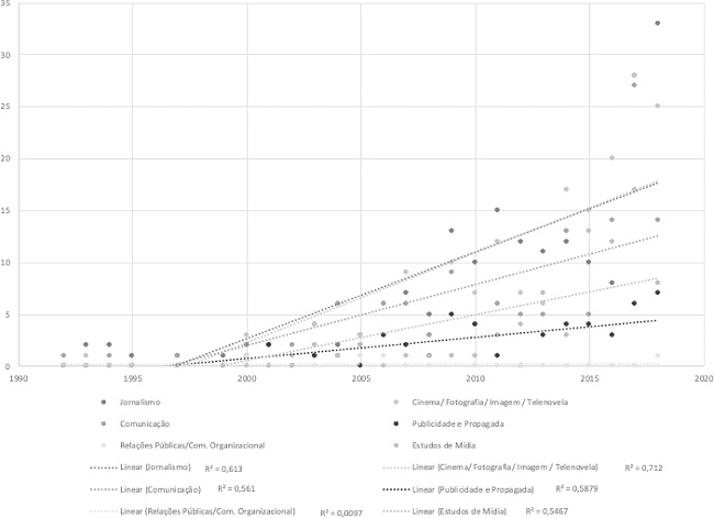 Destaca-se, por outro lado, o avanço na área de Cinema e Audiovisual, com foco e atenção para a telenovela, o que pode ser resultado das discussões de gênero já previamente associadas aos Estudos Culturais (RONSINI; SILVA, 2011). Do mesmo modo, no caso do Jornalismo, o crescimento também é reflexo das preocupações do processo de representação de gênero em função da ligação direta com a formação da opinião pública. Além disso, a feminização das redações (ROCHA; WOITOWICZ, 2017), ocorrida nos anos 1970, também é um provável fator para reforçar pesquisas na área.