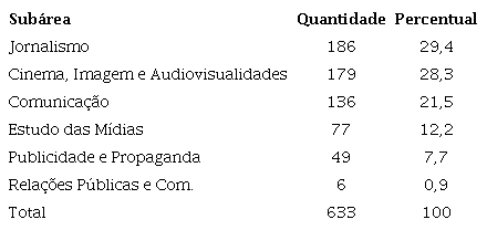 Os primeiros dados apresentados se referem às diferentes subáreas da Comunicação e mostram um desequilíbrio no desenvolvimento dos estudos que envolvem as relações de gênero. Foram considerados cinco subgrupos – Jornalismo; Cinema, Imagem e Audiovisualidades; Estudos de Mídia; Publicidade e Propaganda; e Relações Públicas e Comunicação Organizacional – somados a um grupo mais amplo denominado unicamente como Comunicação, especialmente para trabalhos de reflexão teórica ou de estudos que agrupassem mais de uma das demais categorias. A Tabela 1 indica que o Jornalismo (29,4%) é a área que agrega mais trabalhos sobre Gênero, seguido de Cinema, Imagem e Audiovisualidades (28,3%). Por outro lado, são poucos os trabalhos que discutem Gênero associado às Relações Públicas e Comunicação Organizacional (0,9%) e Publicidade e Propaganda (7,7%).