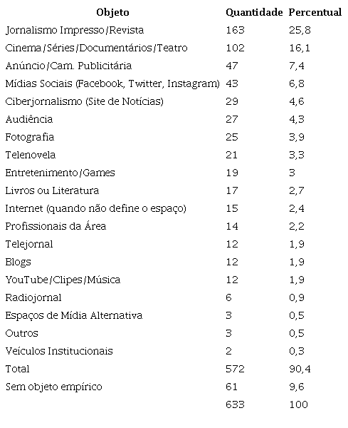 Outra variável observada é o objeto de análise das pesquisas empíricas. Neste caso, são 572 artigos de natureza empírica e 61 trabalhos teóricos. Os dados, conforme a Tabela 2, mostram também um desequilíbrio nos objetos de maior interesse das pesquisas, com prioridade para jornais impressos e revistas (25,8%) e cinema, séries, documentários e teatro (16,1%). Esta preferência tem relação, claro, com as subáreas que mais apareceram acima. Porém, mesmo dentro daquelas subáreas, alguns objetos recebem menos atenção, como é o caso da mídia alternativa, do telejornal e do radiojornal. Destaca-se, por outro lado, as pesquisas com sites de notícias (4,6%), ainda que estejam bem mais distantes do impresso e das revistas.