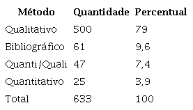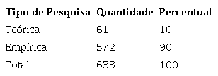 Neste tópico, discute-se como são feitas as pesquisas e a partir de quais estratégias metodológicas são observados os objetos elencados acima. Assim, a Tabela 3 diz respeito à natureza da pesquisa realizada, se teórica ou empírica. Os dados mostram que há predomínio de pesquisas empíricas (90%) ante às pesquisas teóricas (10%), o que vai ao encontro de outros estudos já realizados que indicam cenário similar (DOW; CONDIT, 2005).