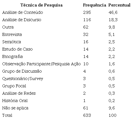 Chama a atenção que 9,8% dos trabalhos apresentam outras abordagens de pesquisa, diferentes daquelas comumente citadas nos livros de metodologia em Comunicação, o que demonstra, de certo modo, uma tentativa de buscar novas formas de olhar para distintos objetos da área. Alguns exemplos são a análise de imagem a partir da teoria da montagem; análise textual pela teoria da argumentação, dentre outros. Por outro lado, observa-se a utilização irrisória de algumas técnicas/abordagens, o que pode ter relação com a baixa presença de certos objetos – como produtores e audiência. É o caso da etnografia, da observação participante, do survey, do grupo focal e da história oral.