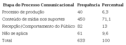 Os dados da Tabela 6 mostram que há uma prioridade dos desenhos de pesquisa pelo foco no conteúdo publicado nos mais variados suportes, desde jornalísticos até fílmicos (71,1%). Na sequência, está a preferência na recepção ou no comportamento do público, que aparece em 13% dos artigos. Neste caso, os trabalhos analisam como questões de gênero interferem no modo como a audiência consome e interpreta os conteúdos.