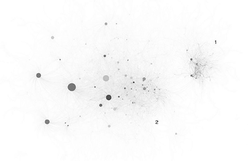 As pessoas mais retuitadas, ou seja, autoras dos tuítes de maior repercussão, não são influenciadores da comunidade, mas sim contas não-verificadas de poucos seguidores, impulsionadas por tuítes que viralizaram. A predominância de tuítes virais na coleta influenciou na morfologia do grafo de interações (Figura 2)3, no qual é possível observar um número expressivo de clusters no formato “estrela”, focalizados em conta com grande alcance.