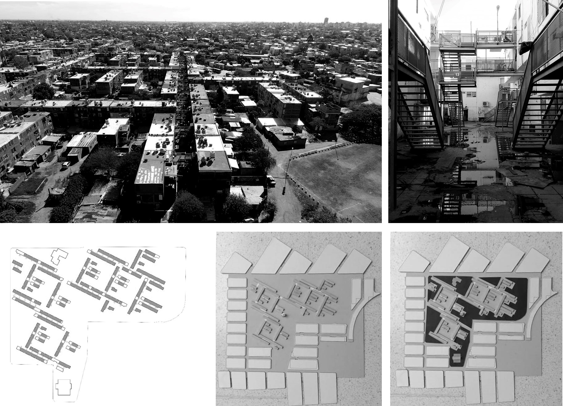 Por el contrario, el segundo caso —el trabajo «Arquitectura documental. El rol de la Arquitectura en la materialización y readecuación de las políticas públicas de vivienda. El caso "Presidente Sarmiento" en Morón»[5], de Pablo Peirano (Figura 1)— surgió de un problema concreto que no se ceñía a la especificidad arquitectónica: el estado actual de ese conjunto habitacional construido en 1973, que articula interrogantes en torno al déficit de vivienda, al deterioro de otros conjuntos de las décadas del 60 y 70, y a la capacidad (o incapacidad) de la arquitectura para dar respuesta a estos problemas a través de políticas públicas.