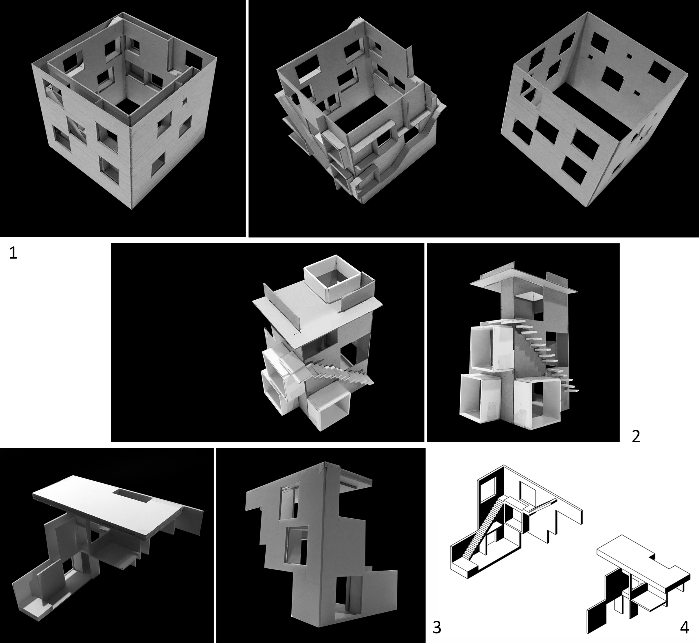 La resultante del recorte, denominada por el maestrando «pieza intersticial», conformará el principal material de proyecto de su trabajo. Si nos detenemos en uno de los seis casos de estudio —la Casa Poli de Pezo & Von Ellrichshausen—, podremos observar el proceso por el cual llega a definir la pieza final: primero, el reconocimiento de la doble envolvente (Figura 2; 1); segundo, el aislamiento de los elementos «ligados a la envolvente interior que conforman el espacio de la doble altura dentro de la obra» (Giraudo) (Figura 2; 2); luego, la identificación definitiva de la pieza intersticial (Figura 2; 3); y, por último, la separación entre los elementos determinantes del espacio interior y aquellos que definen la volumetría exterior (Figura 2; 4). Los instrumentos de representación —y proyecto— involucrados en este procedimiento son los geometrales, los modelos digitales y los modelos físicos.