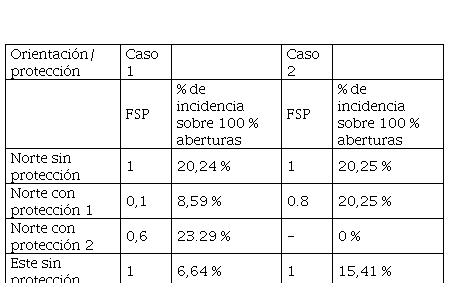 En la Figura 1 puede apreciarse la morfología de los dos casos. Se evidencia la compacidad de las mismas y la orientación con un eje principal hacia el norte. También pueden observarse las grandes superficies acristaladas, así como la presencia de aberturas en las cuatro orientaciones. Para el caso 1, el 22,03 % de la superficie del Cerramiento Vertical Exterior (CVE) está constituida por ventanas, mientras que en el caso 2 lo está en un 33,77 %. En la Tabla 1 se expresa el porcentaje de aberturas en muros, para cada caso, con la incidencia de estas en cada orientación, con y sin protecciones.