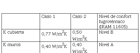 En cuanto a la materialidad, su estructura consiste en una platea de fundación de hormigón armado, donde se fijan unos tabiques portantes antisísmicos materializados con el sistema constructivo tipo Cassaforma. Este sistema consiste en paneles de poliestireno expandido de 100 mm, con mallas de acero de alta resistencia, revocados en ambas caras con 30 mm de mortero cementicio con aditivos. En ambos casos las ventanas se materializan con carpintería de aluminio y vidrio laminado de seguridad sin protecciones móviles y con protecciones fijas, aleros, hacia el norte. Con respecto a las propiedades térmicas de la envolvente, en la Tabla 2 se expresan valores de transmitancia térmica y factor solar de los vidrios.