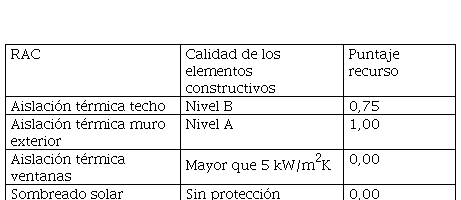 Los RAC más significativos para los casos analizados con sus respectivas calidades de elementos y puntaje de recurso se expresan en la Tabla 3. Se puede observar que la aislación térmica de la envolvente opaca resulta favorable, principalmente la proporcionada por muros, ya que alcanza el nivel máximo de confort higrotérmico, A. Para la zona bioclimática en la que se emplazan, zona cálida (IRAM, 2012), se considera a la morfología compacta como desfavorable, contrario a lo que sucede en otros índices de comportamiento térmico propuestos por IRAM,[1] así como en la etiqueta de EE. La ausencia de protecciones solares en ventanas y la baja aislación térmica provista por ellas resultan situaciones muy desfavorables, con un puntaje igual a cero.