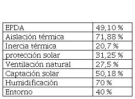 Se obtiene un porcentaje total de EPDA de un 49,10 %. En la Tabla 4 se muestra la incidencia porcentual de cada estrategia de diseño pasivo en la ponderación EPDA total. La estrategia más relevante resulta la aislación térmica, con un aprovechamiento de 71,88 %, seguido por la captación solar en invierno, con una incidencia del 50,18 %.