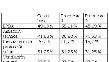A continuación, se analiza la incidencia de ambas mejoras en la ponderación EPDA (Tabla 5). Tras la aplicación de la propuesta 1 mejora de la transmitancia térmica de ventanas, se obtiene un EPDA de 55, 11 %. Con esto, el RAC que mejora es aislación térmica en ventana y la estrategia aislación térmica es la que expresa un importante incremento, de 71,88 % a 86,88 %. Con la aplicación de la propuesta 2 se modifica el RAC proporciónde ventanas en muros, pero, según la normativa, este pasa a tener un puntaje inferior. La propuesta 2 supone un cambio desfavorable en la ponderación EPDA, con un valor de 48,19 %. En este caso, se considera una disminución de la incidencia de la estrategia aislación térmica .inercia térmica de 71,88 a 70,63 % y de 20,7 a 15,7 %, respectivamente. Esto se debe a que, para la localidad analizada, perteneciente a la zona bioclimática II b, la disminución de aberturas se considera desfavorable.