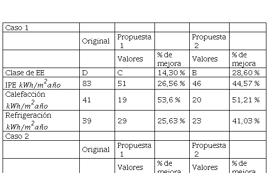 En las etiquetas de EE se percibe una mejora sustancial en todos los casos (Figura 4). Con la aplicación de la propuesta 1 se genera un ascenso de clase: para el caso 1 de D a C, y para el caso 2 de C a B; y una reducción en el IPE de 83 kWh/m.año a 51 kWh/m.año y 55 kWh/m.año a 39 kWh/m.año, respectivamente. Con la propuesta 2, se obtiene para ambos casos clase B, y el IPE obtenido es inferior, 46 kWh/m.año y 31 kWh/m.año.