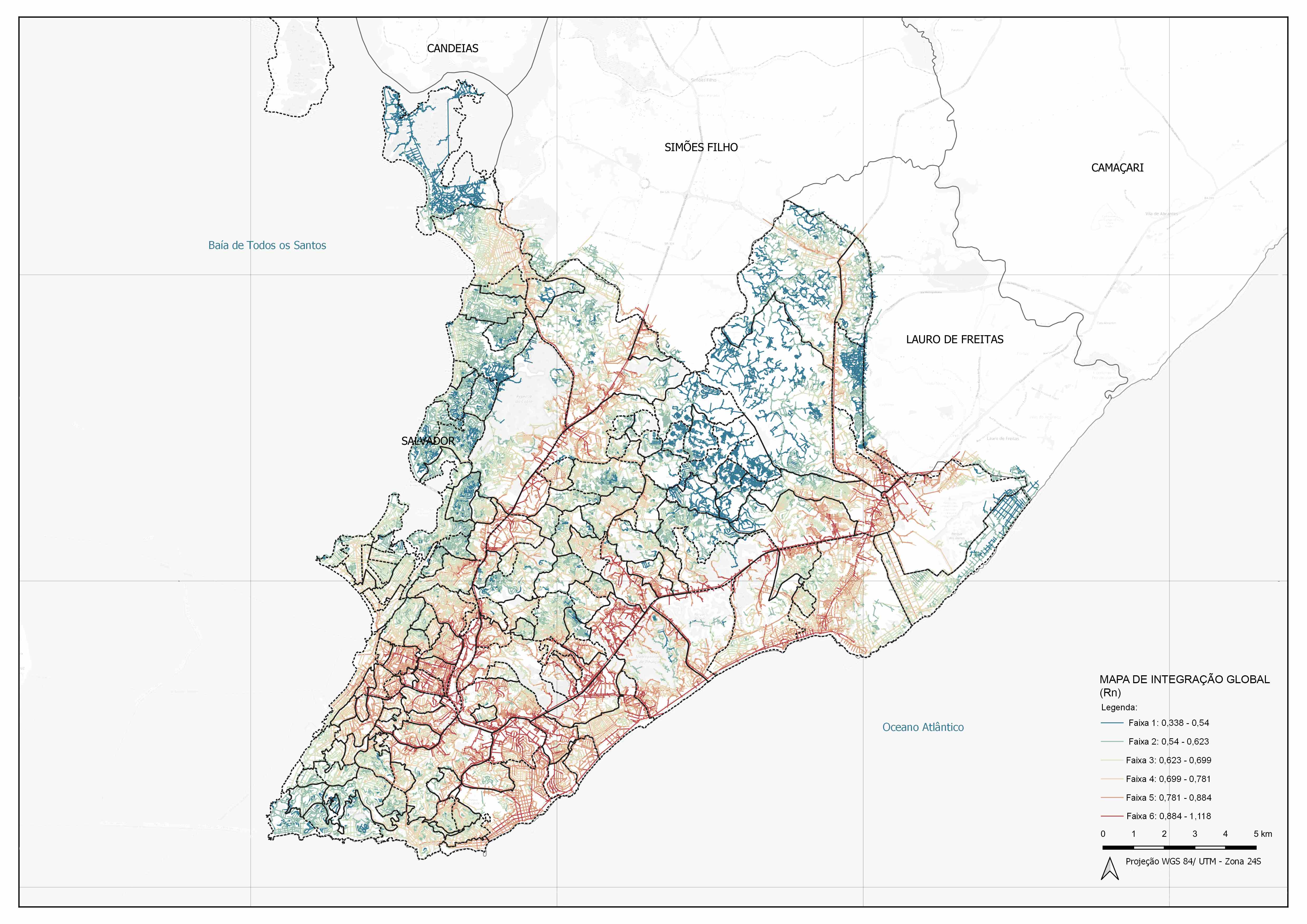 O contexto global (Rn) identifica as zonas mais integradas de Salvador, ou seja, qual o nível de importância que as vias estruturantes exercem sobre a acessibilidade nessa escala. As vias mais integradas compõem-se também com os vetores de expansão urbana da cidade, tendo suas vias principais a BR-324, a Avenida Luís Viana (Paralela) e a Avenida Octávio Mangabeira (Orla). Essas vias exercem tanto o papel de vetor de crescimento como de vias integradoras no contexto global.