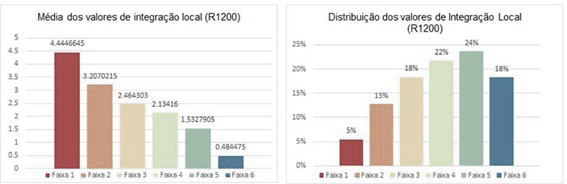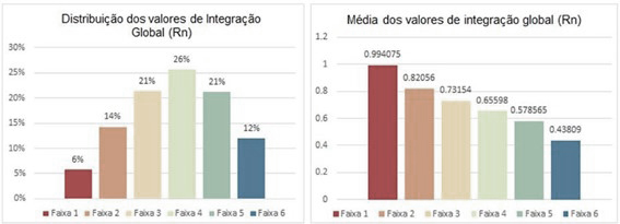 Os valores de integração foram distribuídos em seis faixas de análise, seguindo o critério de identificação de cores determinado pelo software Depthmap®. A figura 5 mostra a distribuição e a média dos valores de Integração Global (Rn). Em relação a distribuição dos valores por faixas, percebe-se que a maioria dos valores tendem a se concentrar entre as faixas 3 e 5, faixas medianas. Os maiores valores de integração, correspondente à faixa 1, representam apenas 6 % do total, enquanto os valores que indicam zonas mais segregadas, faixa 6, são 12 % do total. As médias de Integração Global (Rn) correspondem aos valores médios de integração para cada faixa.